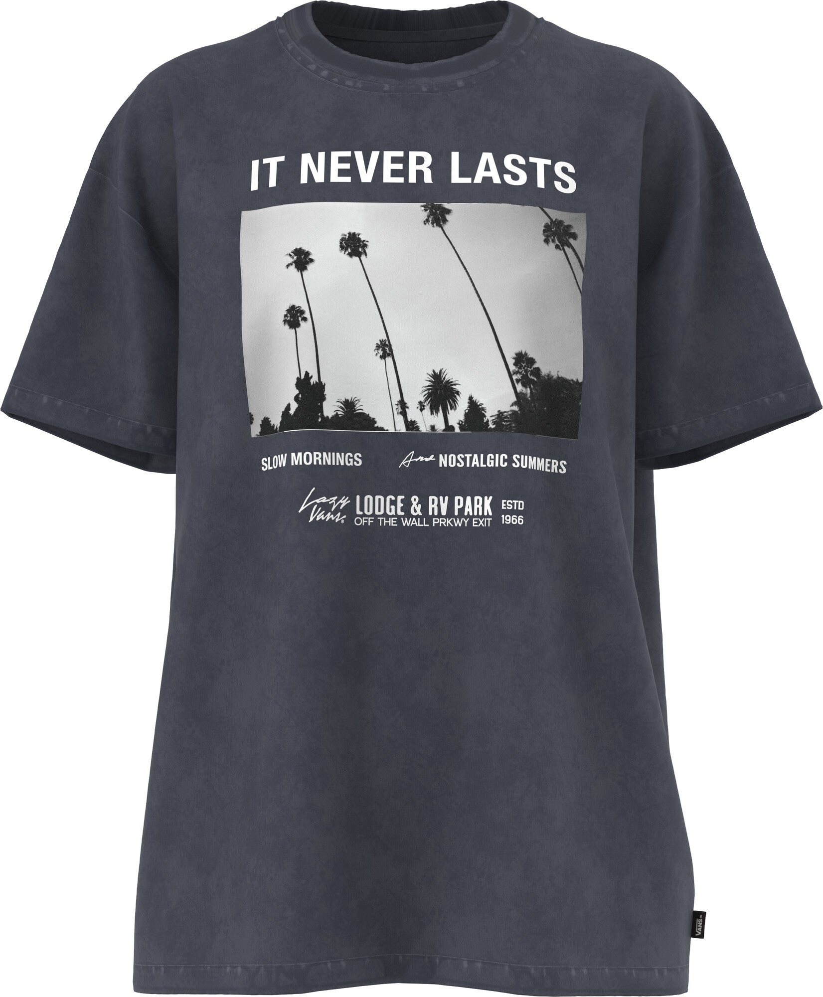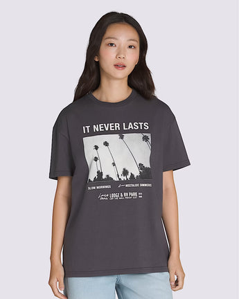 Let go in the Photo Neverlasting T-Shirt, an oversized heavy cotton jersey crew neck T-shirt. It features a graphic of photographed palm trees with additional Vans® branding.